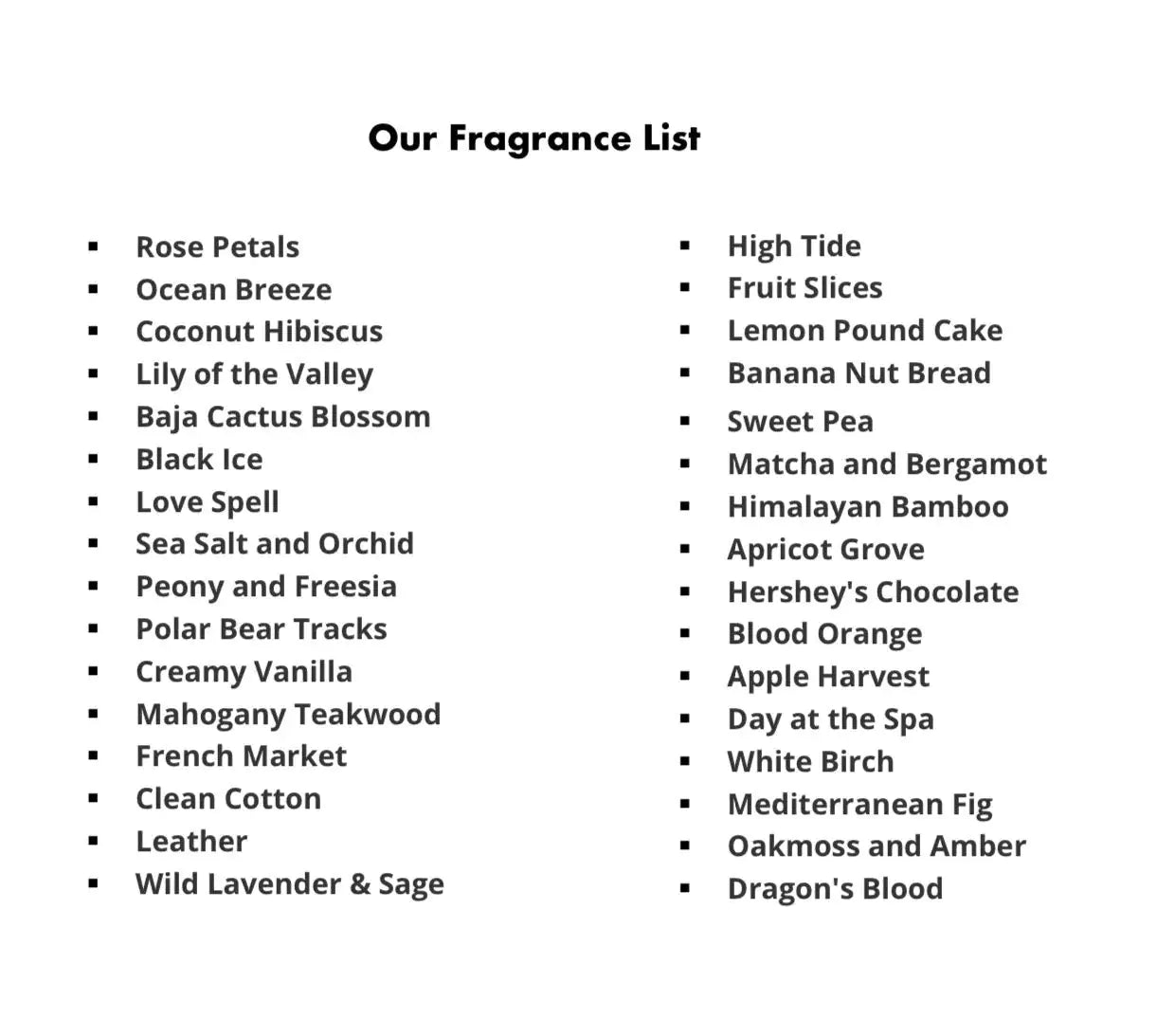 Refer to our scent list in the product images for the complete fragrance menu and make your selection at checkout.