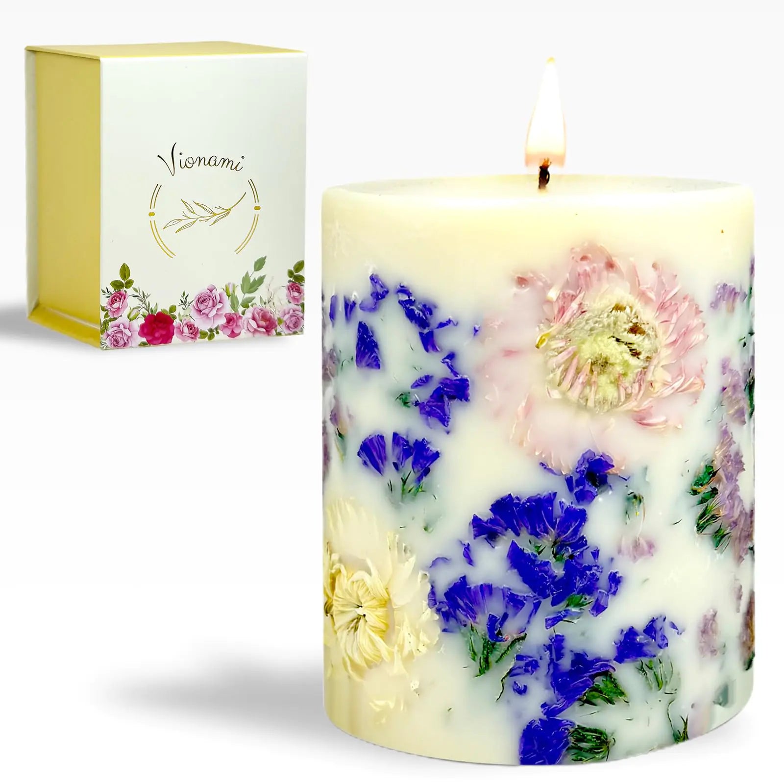 Vionami Gifts for Women Scented Pillar Candle - Long Burning Natural Soy Wax Scented Candle for Home - Gift-Boxed Hand Poured Luxury Candle with Dried Flowers & Tropical Rare Flower Scent (Forget Me)
